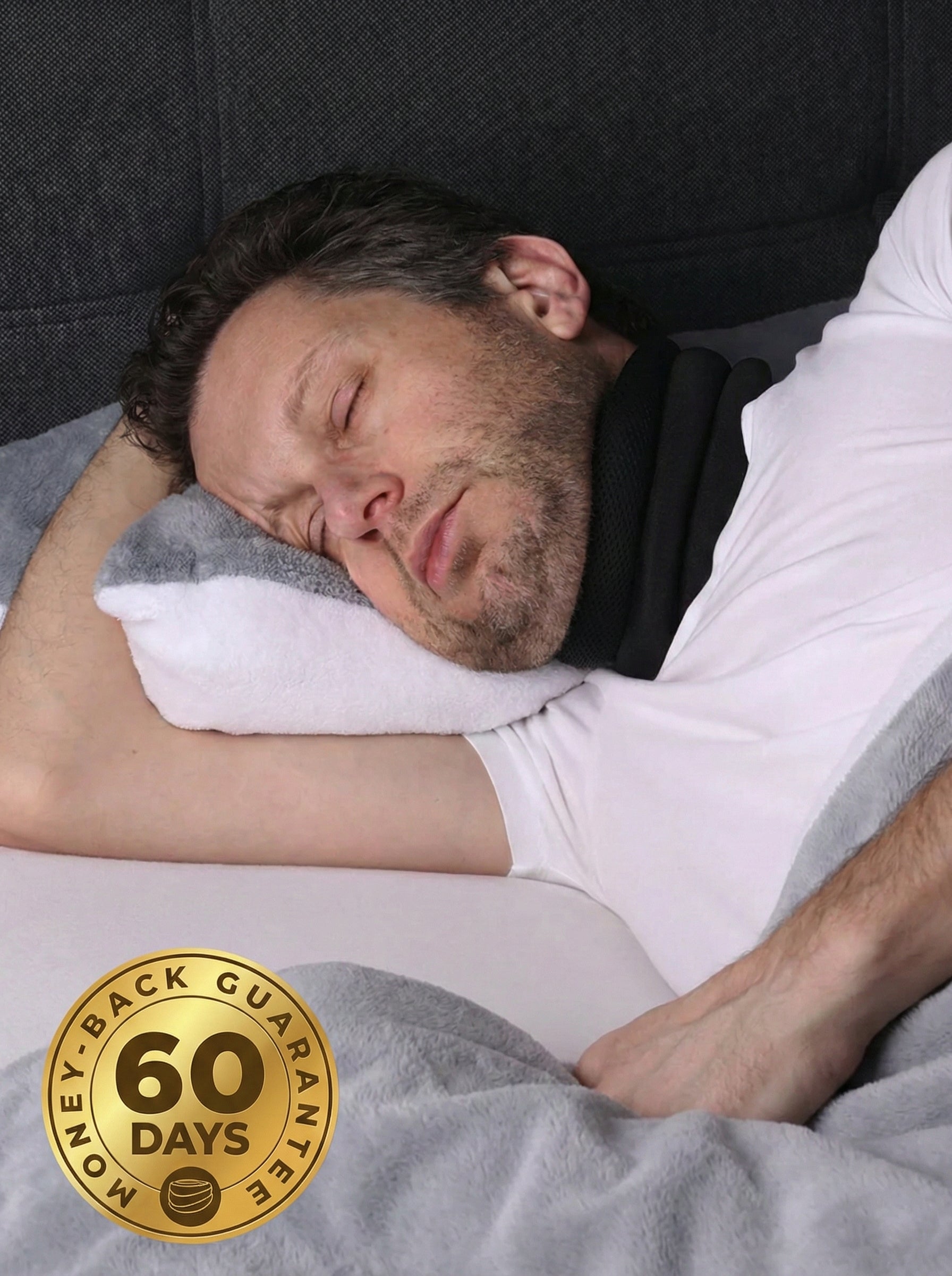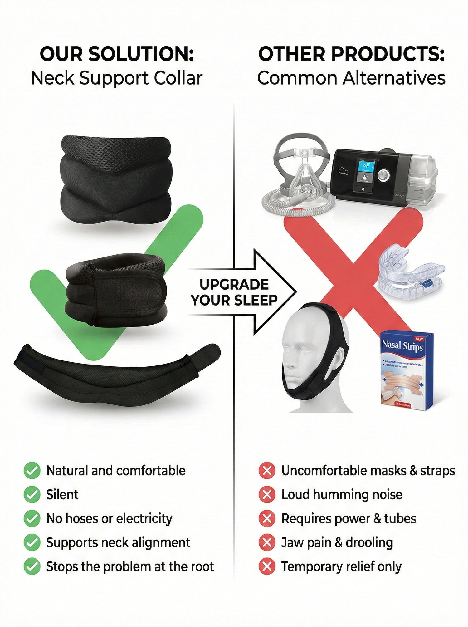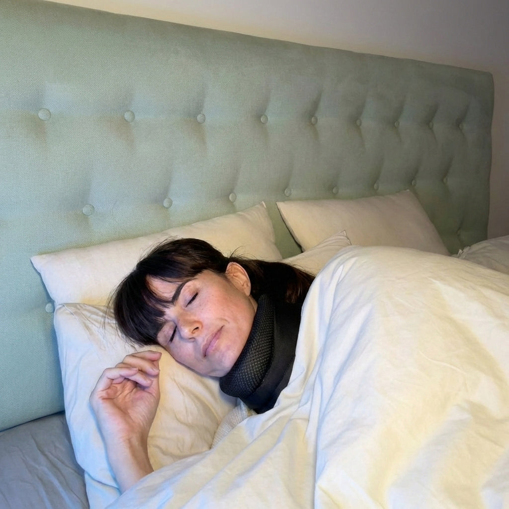 Unlike uncomfortable mouthguards, bulky CPAP machines, or irritating nose strips, our neck brace is lightweight, breathable, and easy to wear all night long. It’s the perfect, hassle-free way to enjoy peaceful sleep without disruption or discomfort.